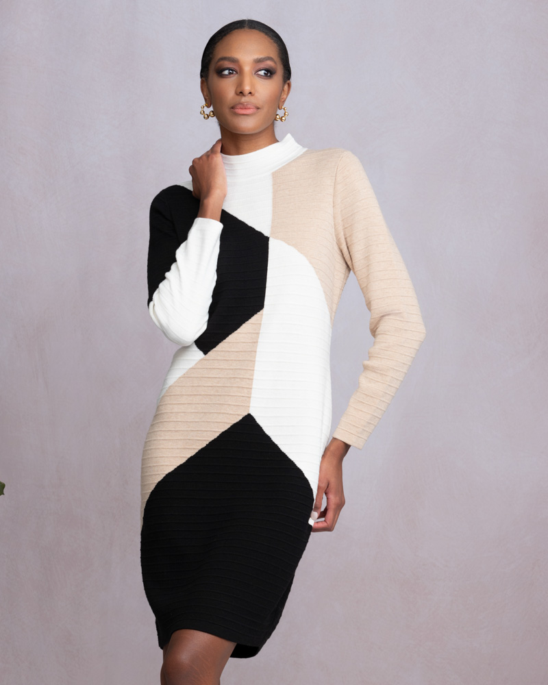Turtle Neck Geometric Pattern Long Sleeved Knitted Dress.