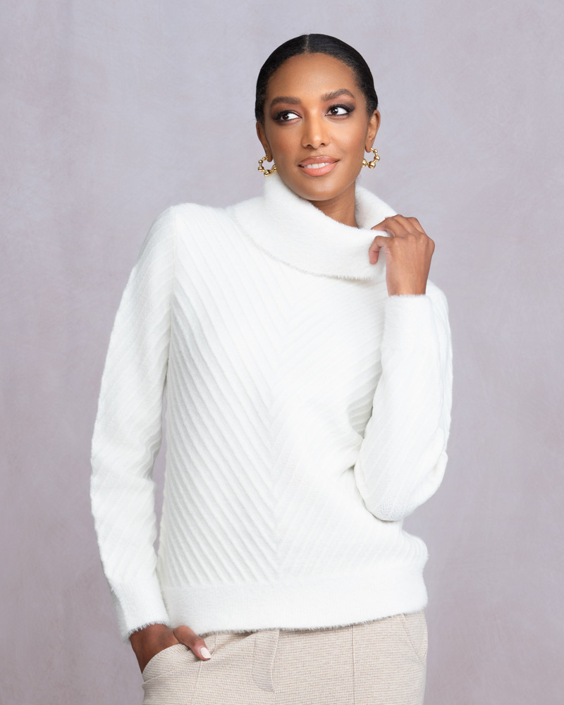 White fluffy cowl neck jumper with a geometric knit pattern.