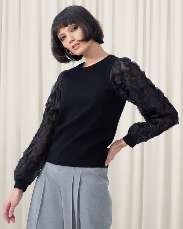 Beautiful round neck sweater with sheer ruffled long sleeves.