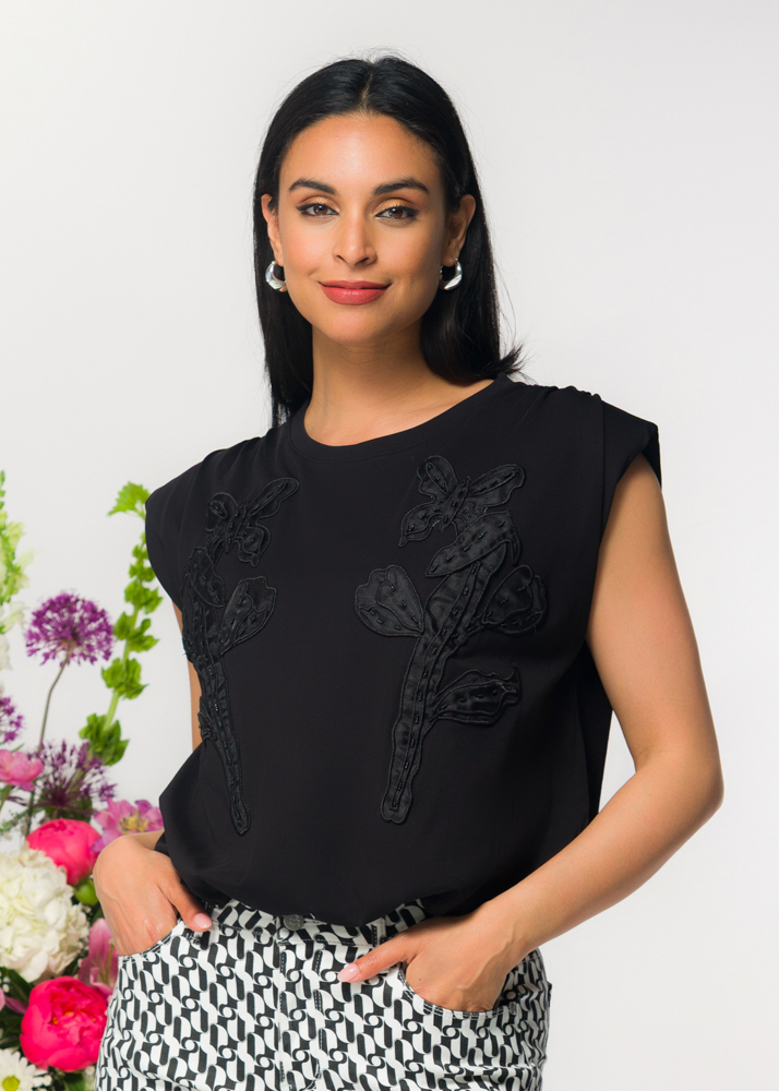 ELENA WANG BLACK SLEEVELESS TOP WITH APPLIQUE DETAIL TO FRONT
