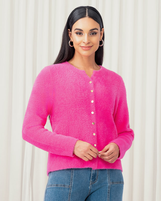 Fluffy Fushia Round Neck Cardigan with metallic button detail.
