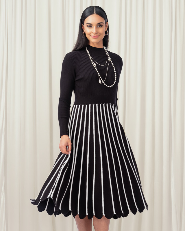 Black Cowl Neck Knitted Dress with Flared Skirt with white line detail