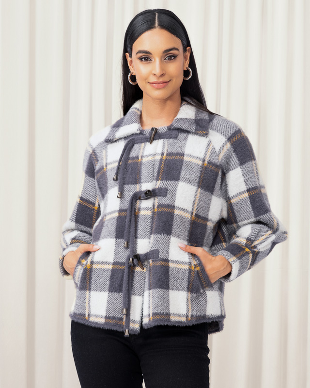 Elena Wang – EW35122 Grey Chequered Duffle Style Jacket