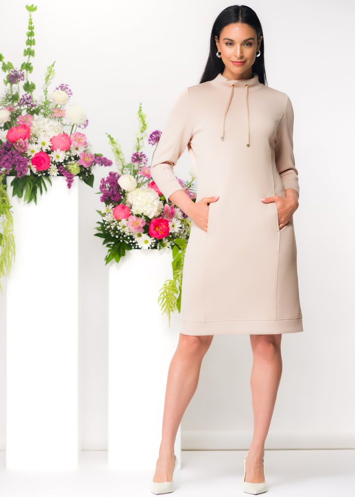 Elena Wang super soft dress with drawstring neck, shiny stud detail to arms and front hidden pockets.