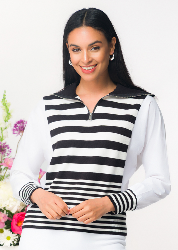 Elena Wang Striped black and white part knitted top with white cotton arms/side panels and striped knitted cuff detail. Zipped neck detail.