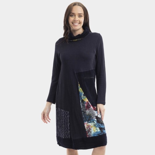 Black Cowl Neck Patch Dress.  Zip Pocket detail to front.